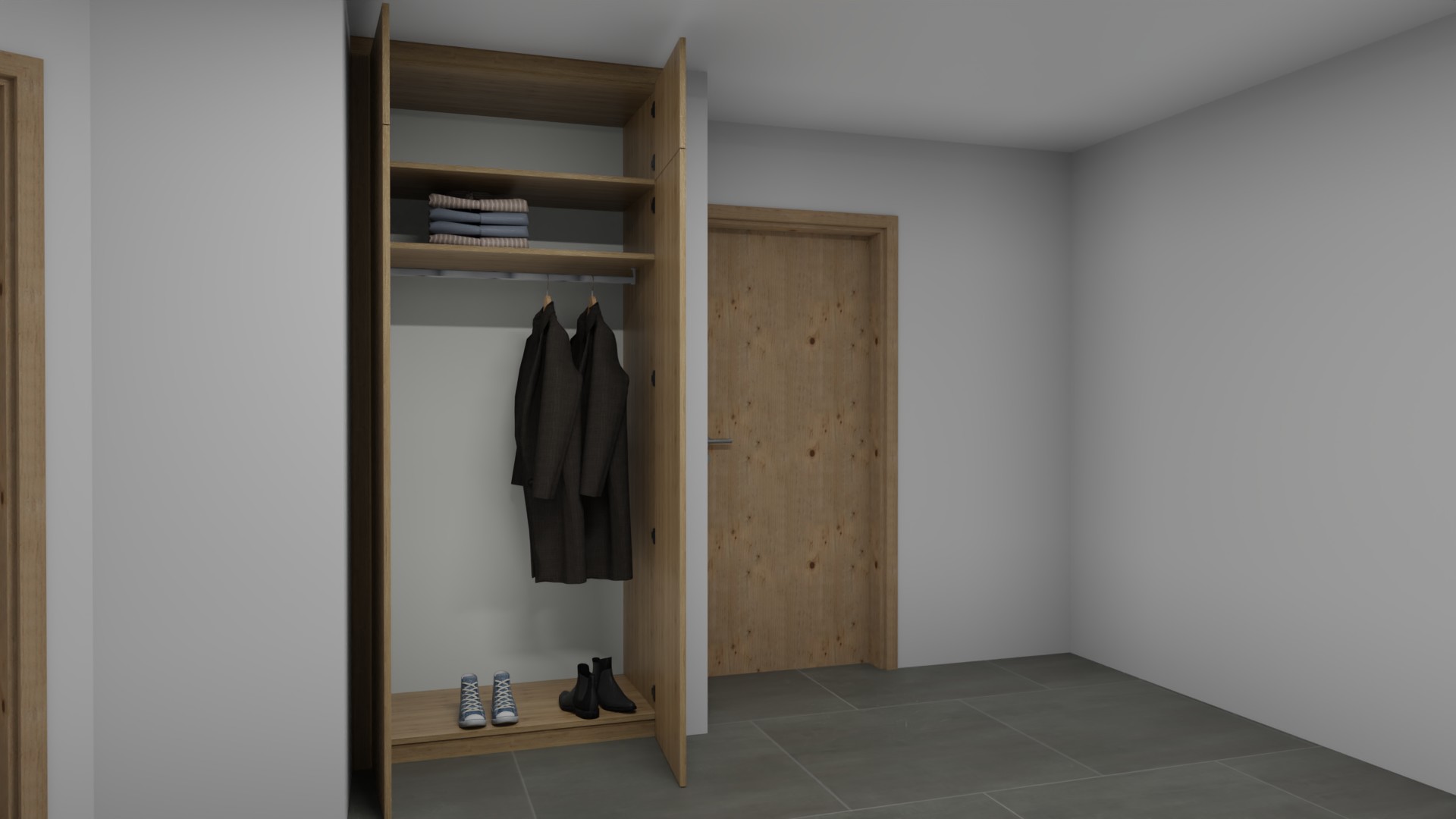 Vor Ort wurden im letzten Schritt die genaue Aufteilung der Fronten verplant und die exakte Höhe der Kleiderstange bestimmt. Mit Hilfe der photorealistischen Renderings konnte dem Kunden die Sicherheit gegeben werden, dass das Endergebnis in der Realität auch stimmig mit der vorhandenen Raumgestaltung ist.