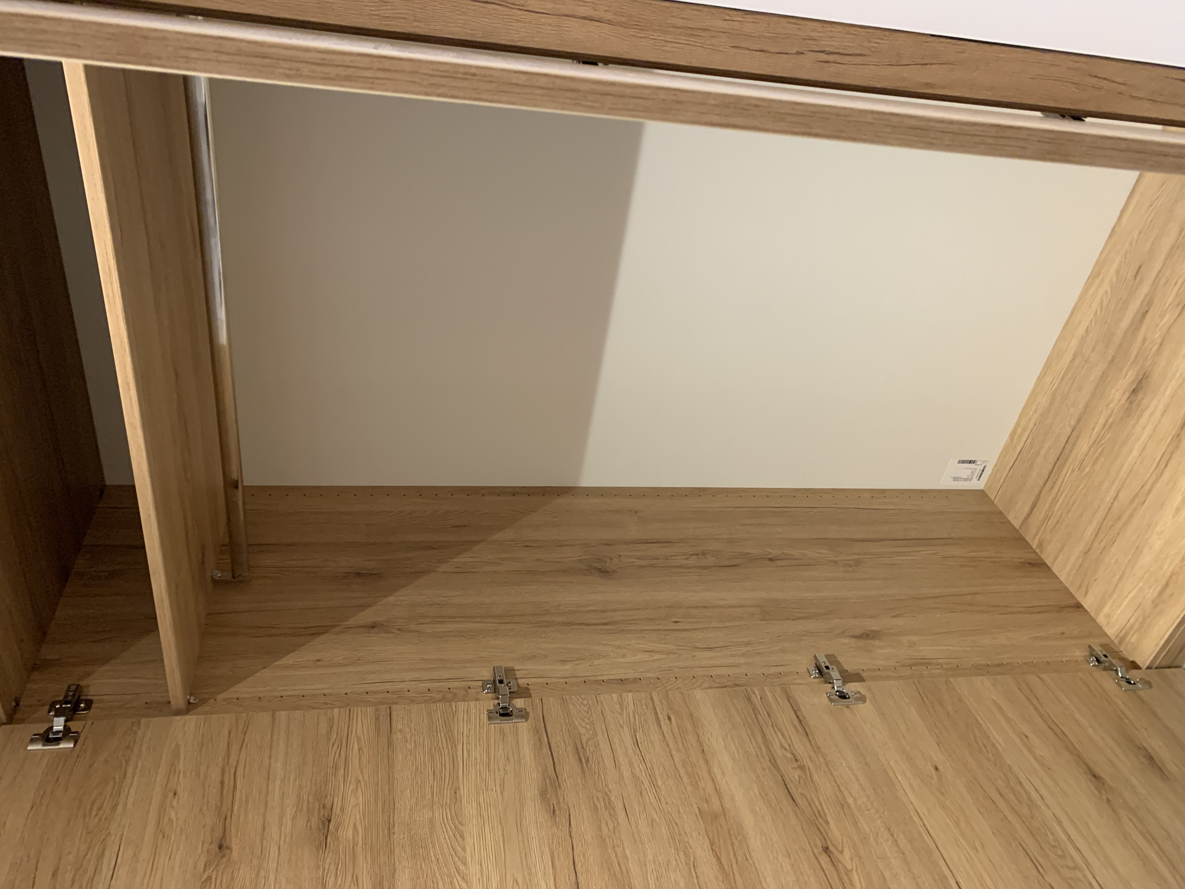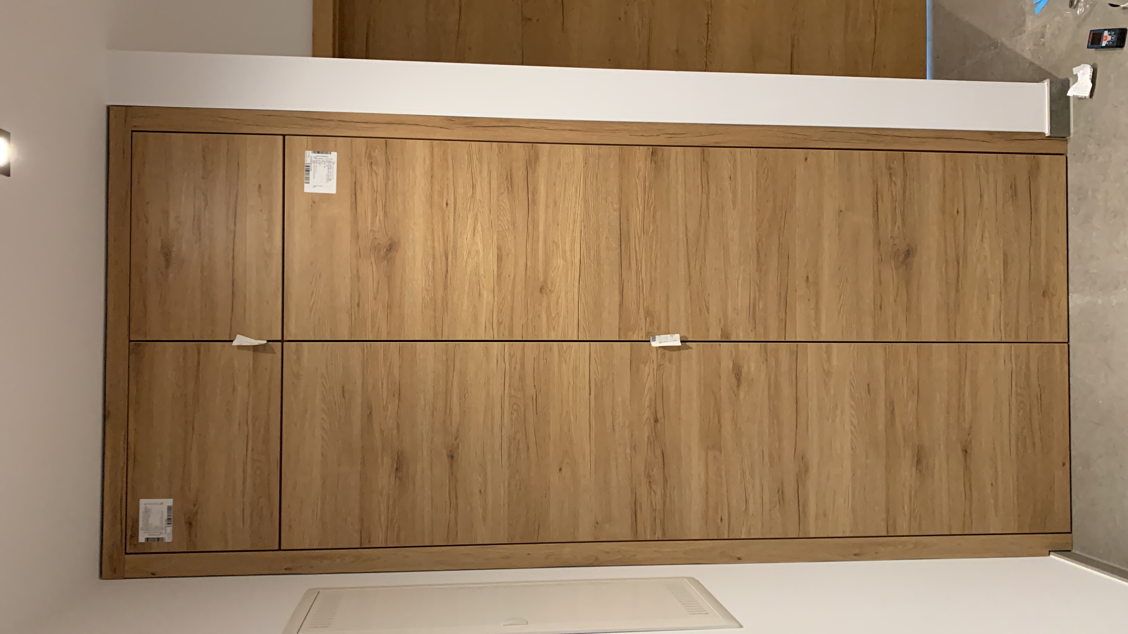 Bei diesem Garderoben Schrank lagen die Kernanforderung im Dekor und der flächenbündigen und bodentiefen Ausführung der Fronten. Dekor und Dekorverlauf sollten hier so gut wie möglich mit denen der Zimmertüren übereinstimmen.